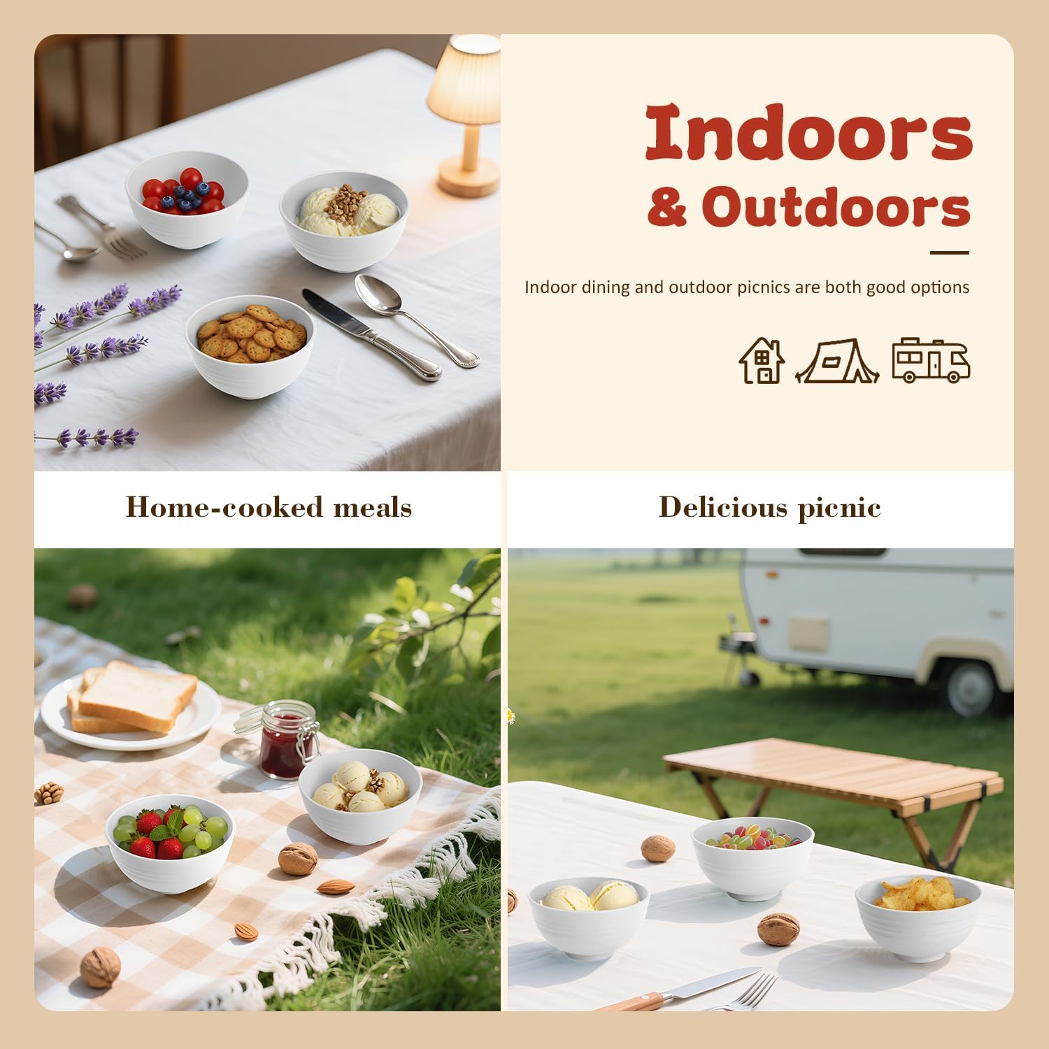 - ใ๐๐ป๐ฑ๐ผ๐ผ๐ฟ๐ & ๐ข๐๐๐ฑ๐ผ๐ผ๐ฟ๐ ๐จ๐๐ถ๐ป๐ดใ- These bowls are lightweight and unbreakable, featuring a smooth surface that makes cleaning effortless. Perfect for camping, RV trips, and outdoor adventures.