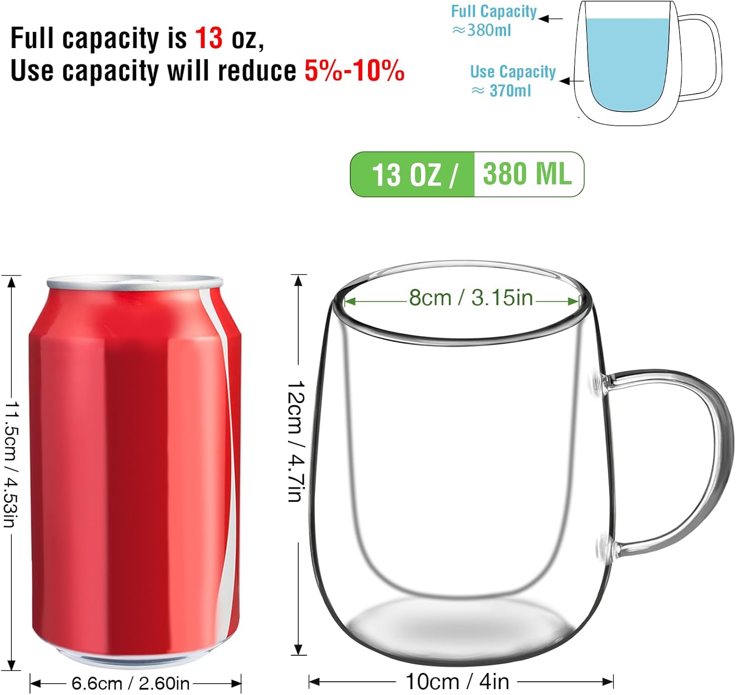 - DOUBLE WALLED GLASS COFFEE MUGS- Double Wall of the glass coffee cups ensures your safety when touching cold or hot drinks, also makes it an insulated coffee mug to keep the temperature of drinks for longer time. Transparent design of the glass cups adds more elegance and joy to drink.