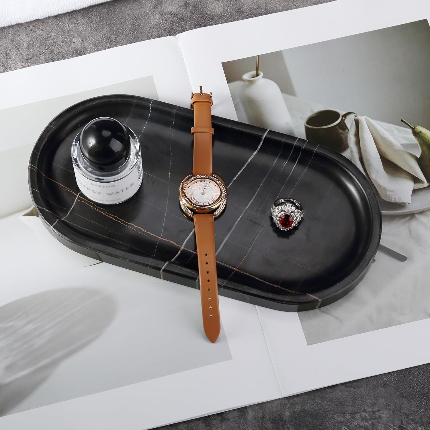 Koville Black Marble Vanity Tray for Bathroom Countertop, 10"x5" Natural Marble Catchall Tray Perfume Trays for Dresser, Stone Jewelry Dish Candle Holder for Home Decor, Stone Oval Trays