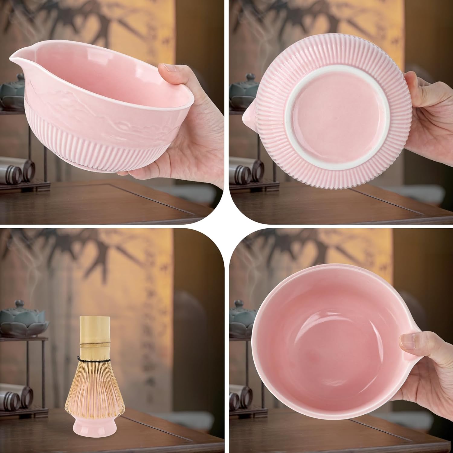 PHILORN Matcha Whisk Set 9Pcs Ceramic Matcha Kit Matcha Bowl with Spout, Whisk, Holder, Bamboo Scoop, Scoop Rest, Sifter and Tea Towe for Matcha Lover and Tea Ceremony (Pink)