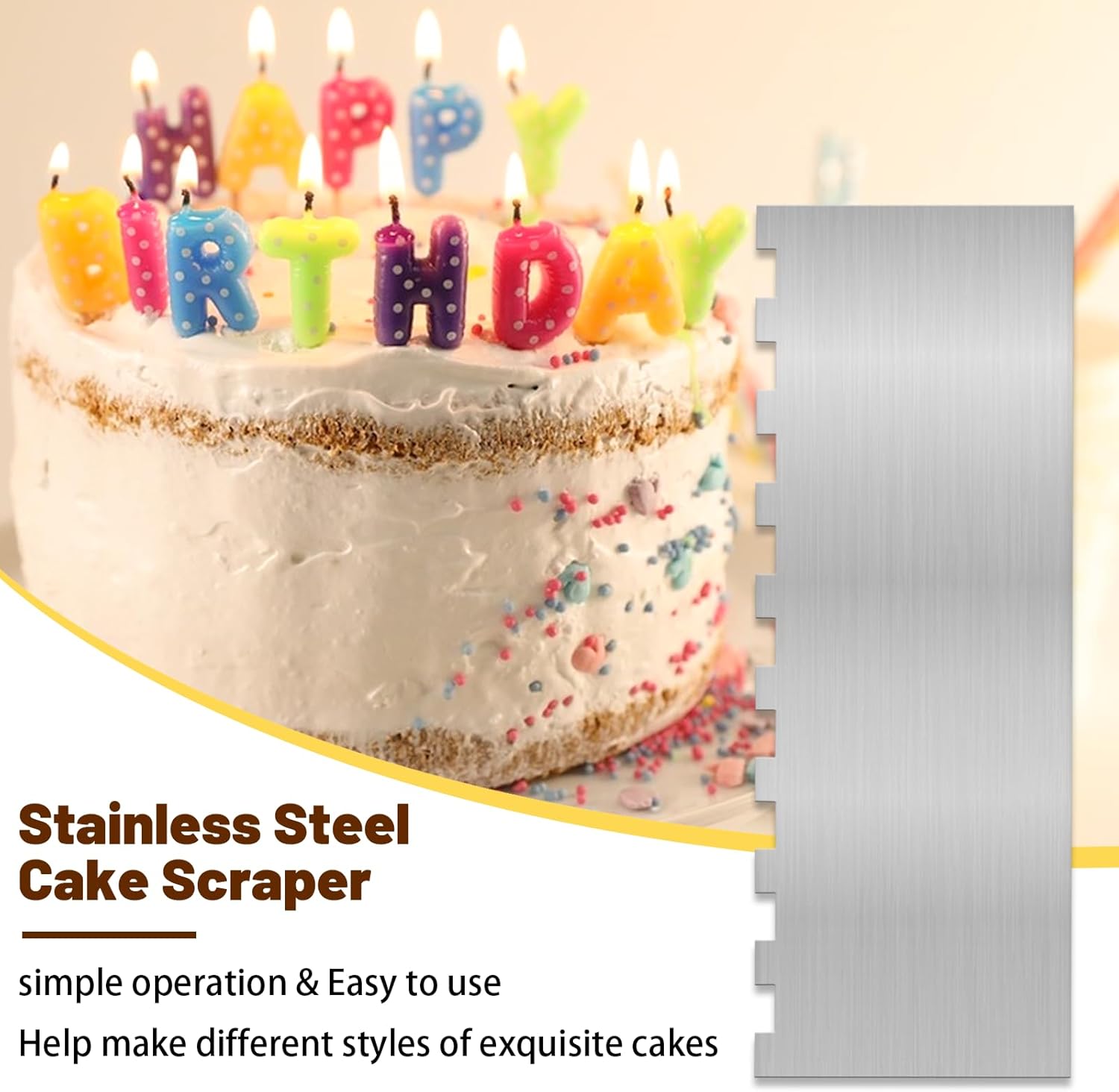 - What’s Included Each package includes 1 stainless steel cake scraper with 2 patterns (smooth edge and striped edge). Measuring 8.7 inches, it’s the perfect size for handling cakes of all shapes and sizes. Whether you’re a beginner or a pro, this tool will help you create beautiful, professional-quality cakes every time