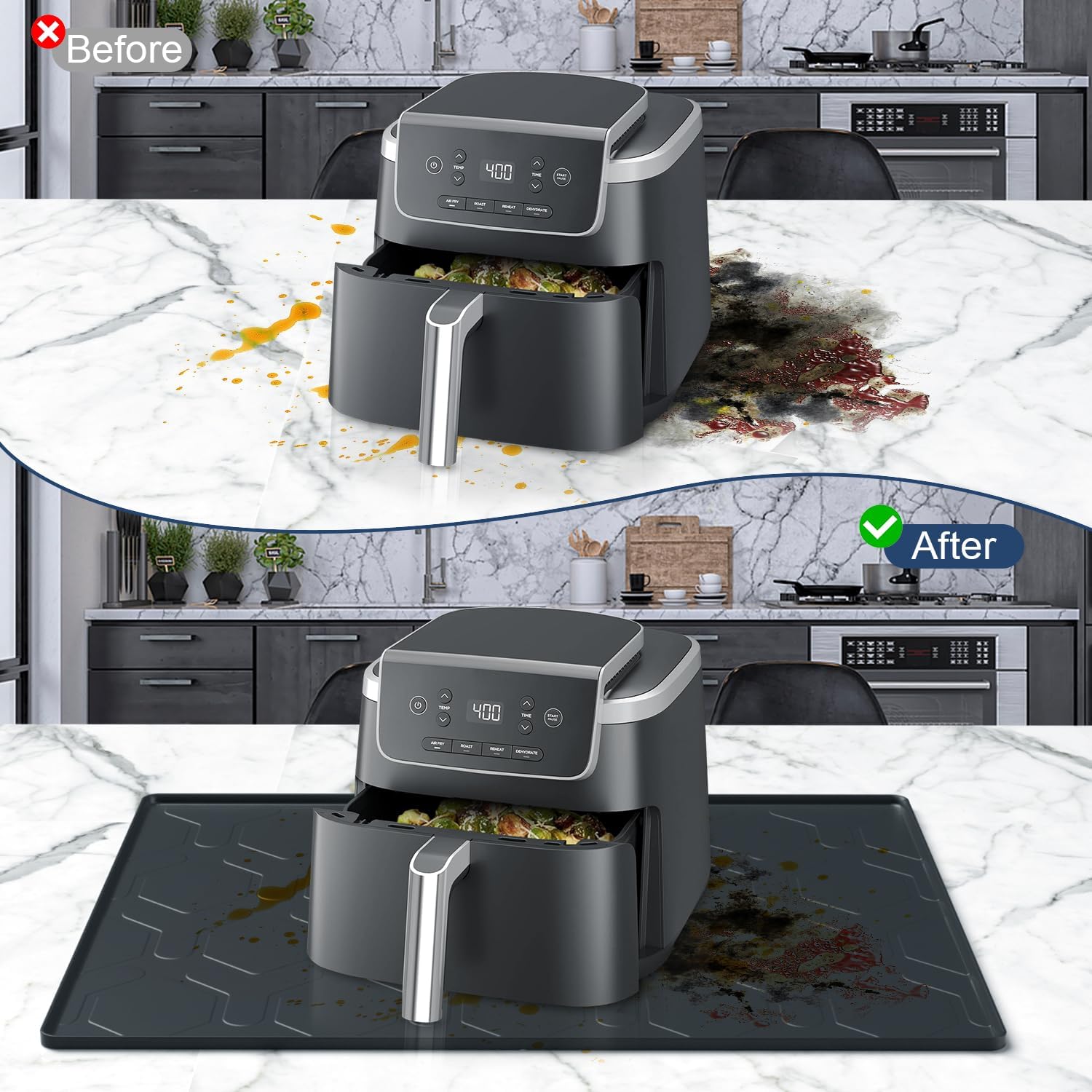 - Countertop Protection & Versatile Use: 17.7" x 14" extra-thick silicone mat, heat-resistant, suitable for air fryers, coffee makers, blenders, and other kitchen appliances. Effectively protects your countertop from scratches, spills, and heat damage.