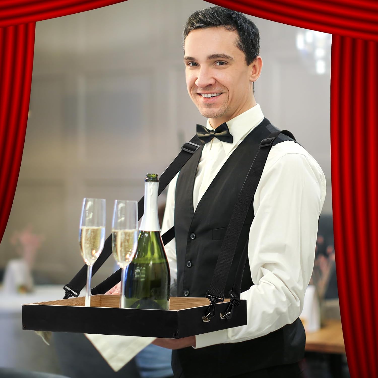 - Reliable and Sturdy: our retro beverage trays are made of quality wood, durable and safe, ensuring they can handle a variety of snacks and drinks without compromising quality; The straps are made of plastic and nylon materials, strong and lasting; You can tie a ribbon around your neck and back to easily fix the tray