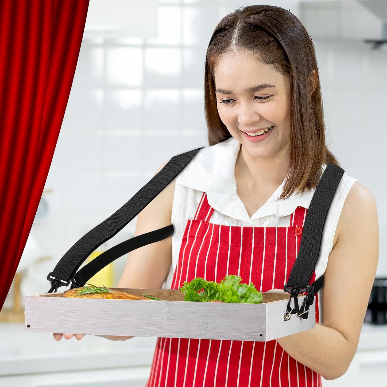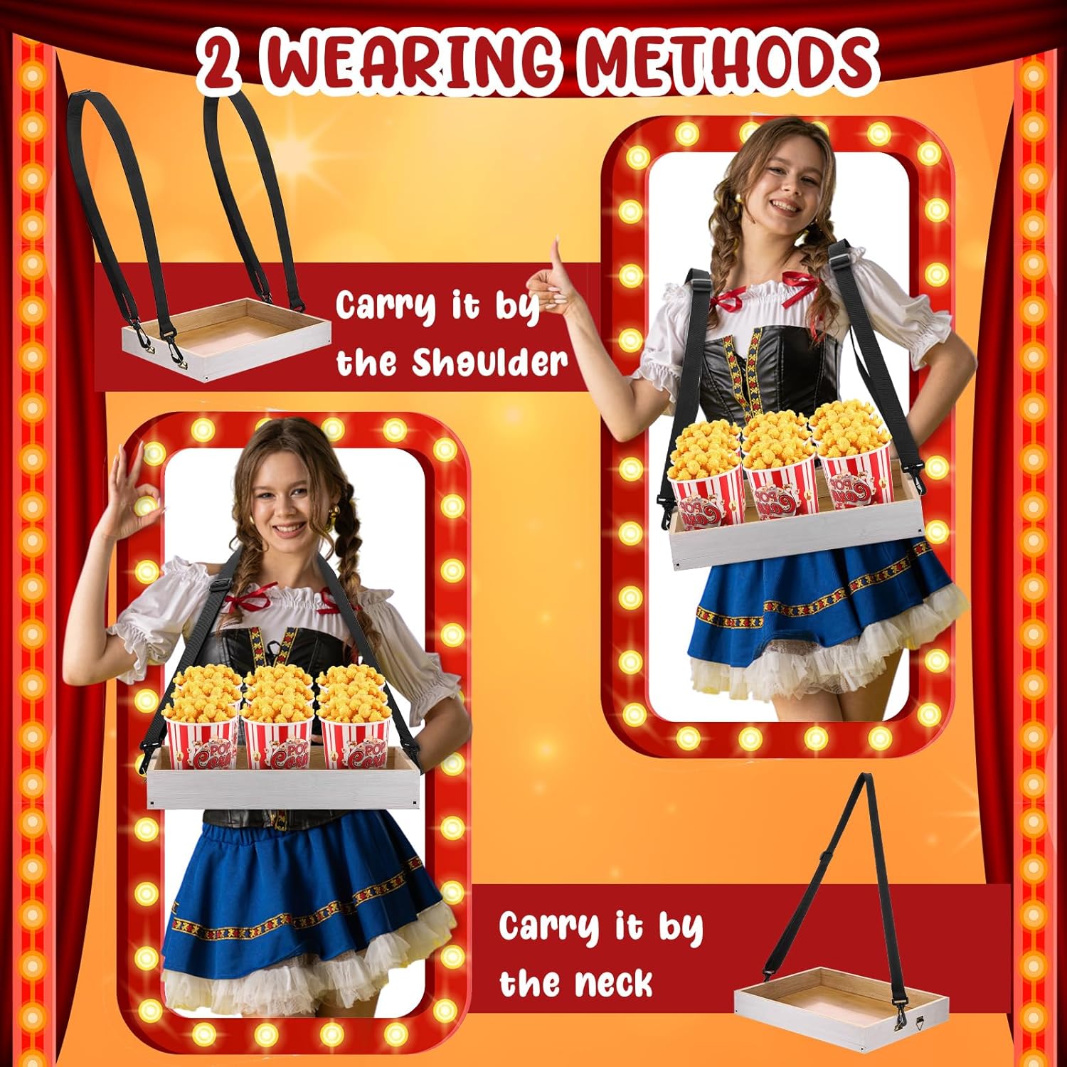 - Reliable and Sturdy: our retro beverage trays are made of quality wood, durable and safe, ensuring they can handle a variety of snacks and drinks without compromising quality; The straps are made of plastic and nylon materials, strong and lasting; You can tie a ribbon around your neck and back to easily fix the tray