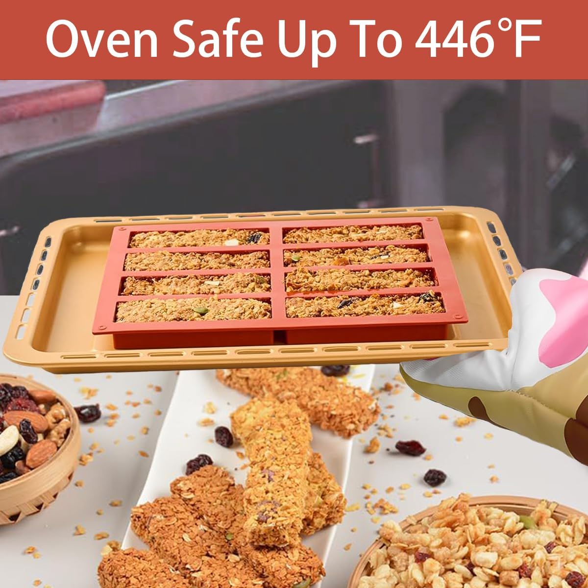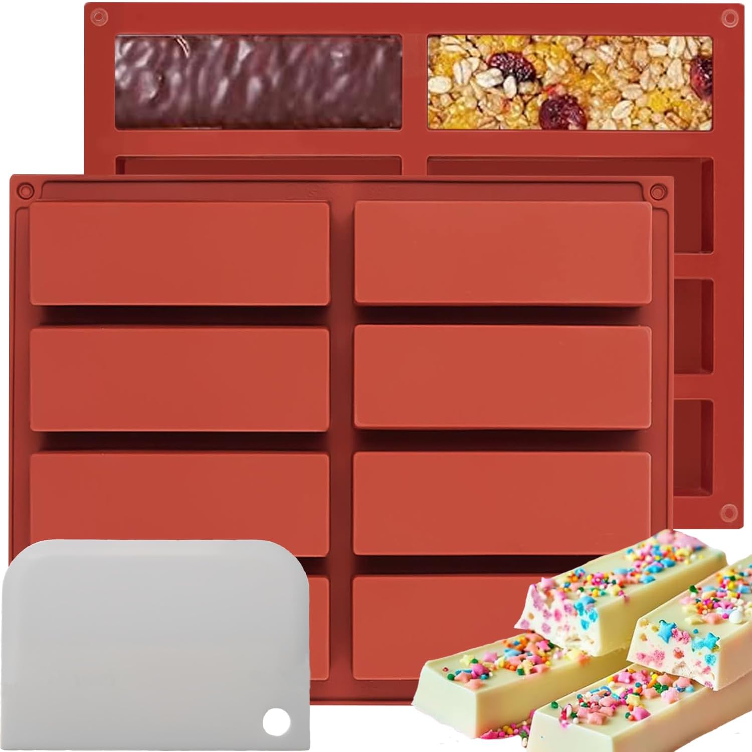 - Easy Baking: Includes a 2-piece set of 8-cavity granola bar silicone molds and a 3-piece set of baking spatulas to help you easily create your favorite chocolate bars, nutritious cereal bars, protein energy bars and brownie cake cheesecake and other desserts and snacks, and unleash your culinary creativity.