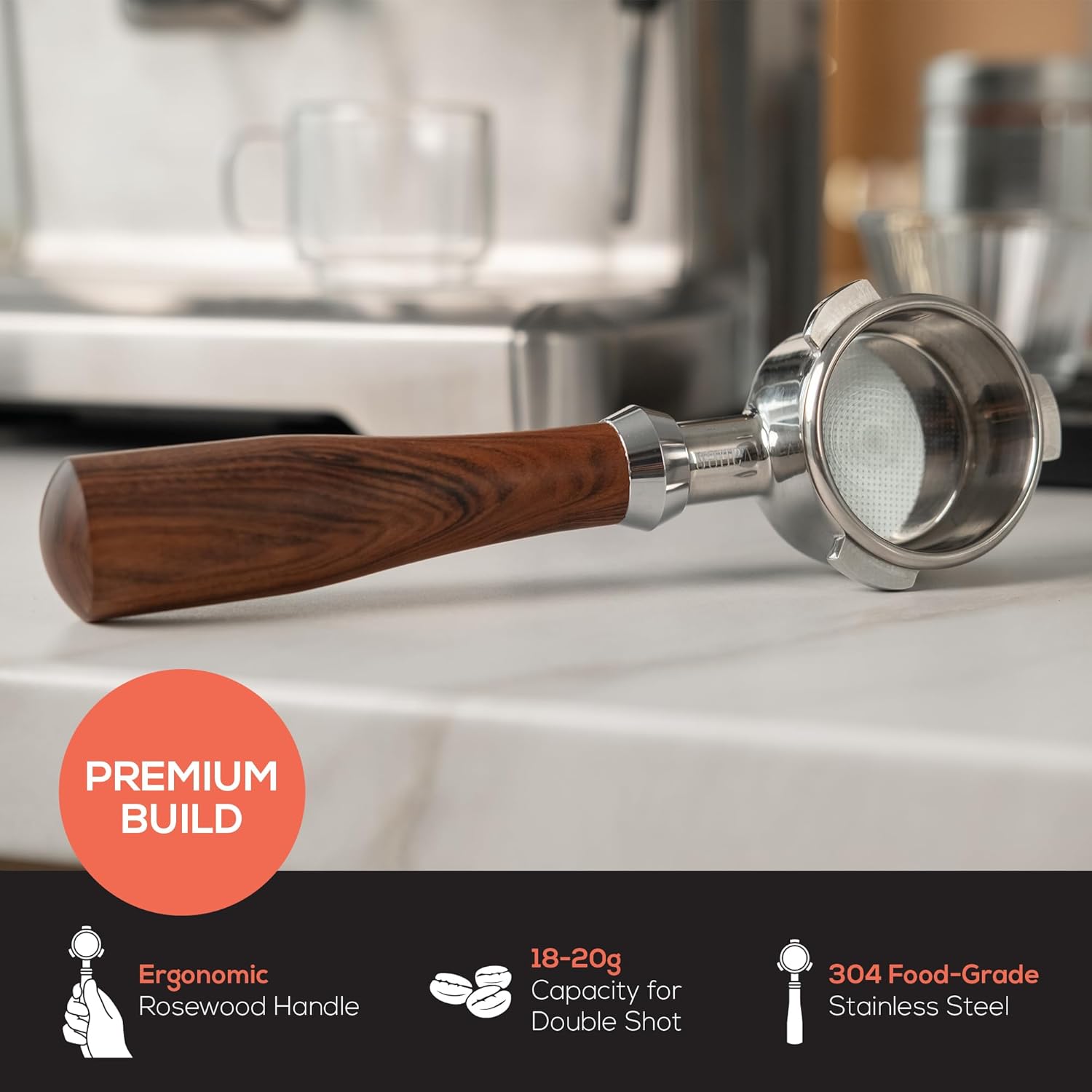 - PREMIUM BUILD: Crafted from food-grade stainless steel 304 with an ergonomic red rosewood handle, this 54mm bottomless portafilter holds 18-20g for a perfect dose and lasting performance.