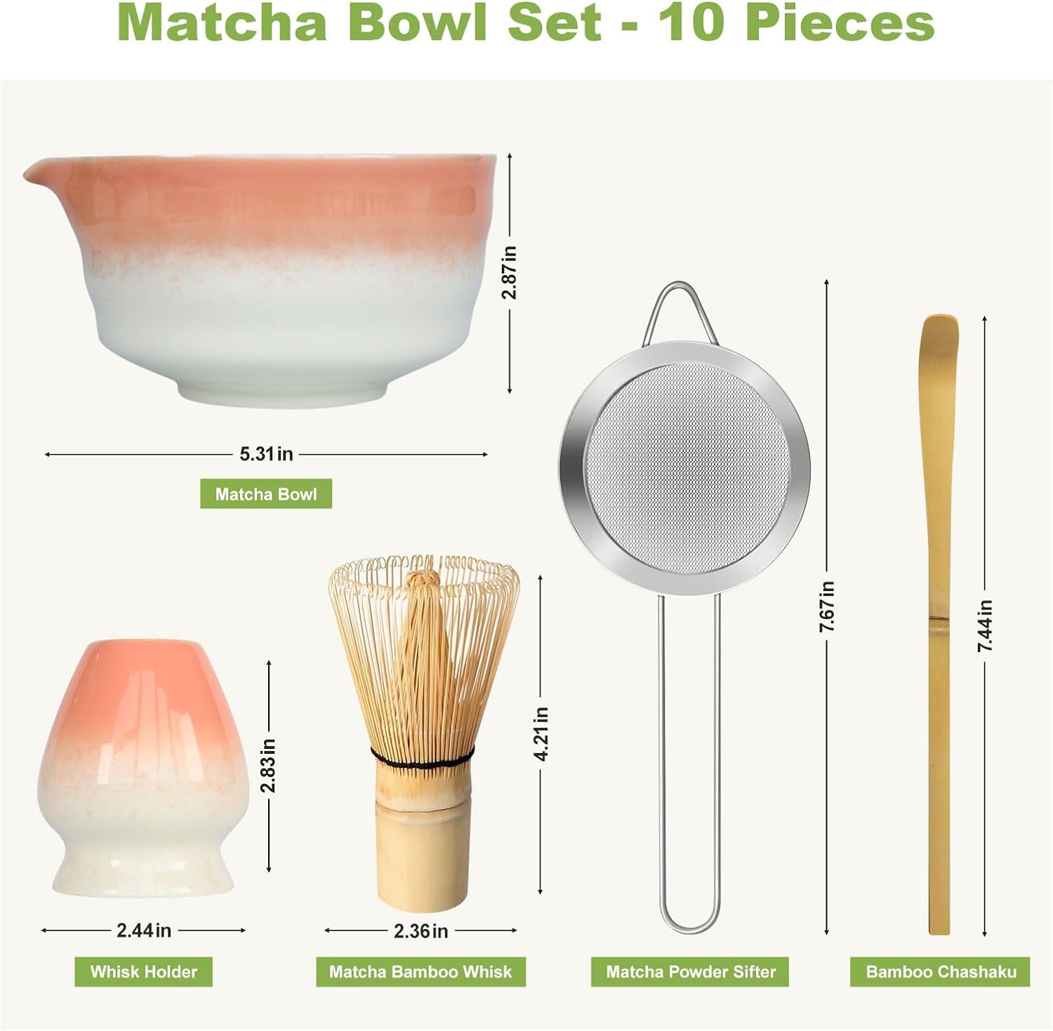 - Complete 7-Piece Matcha Kit: Includes ceramic chawan bowl with spout, handcrafted bamboo whisk, bamboo scoop, whisk holder, and stainless steel sifter for authentic matcha preparation
