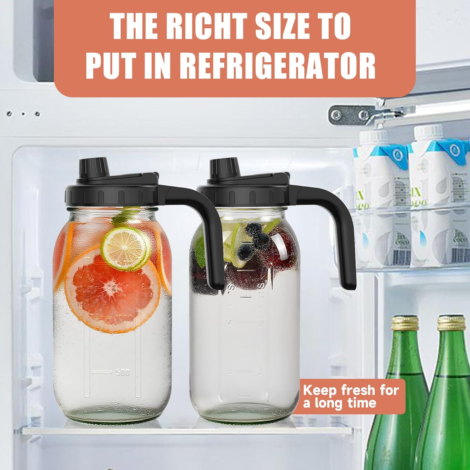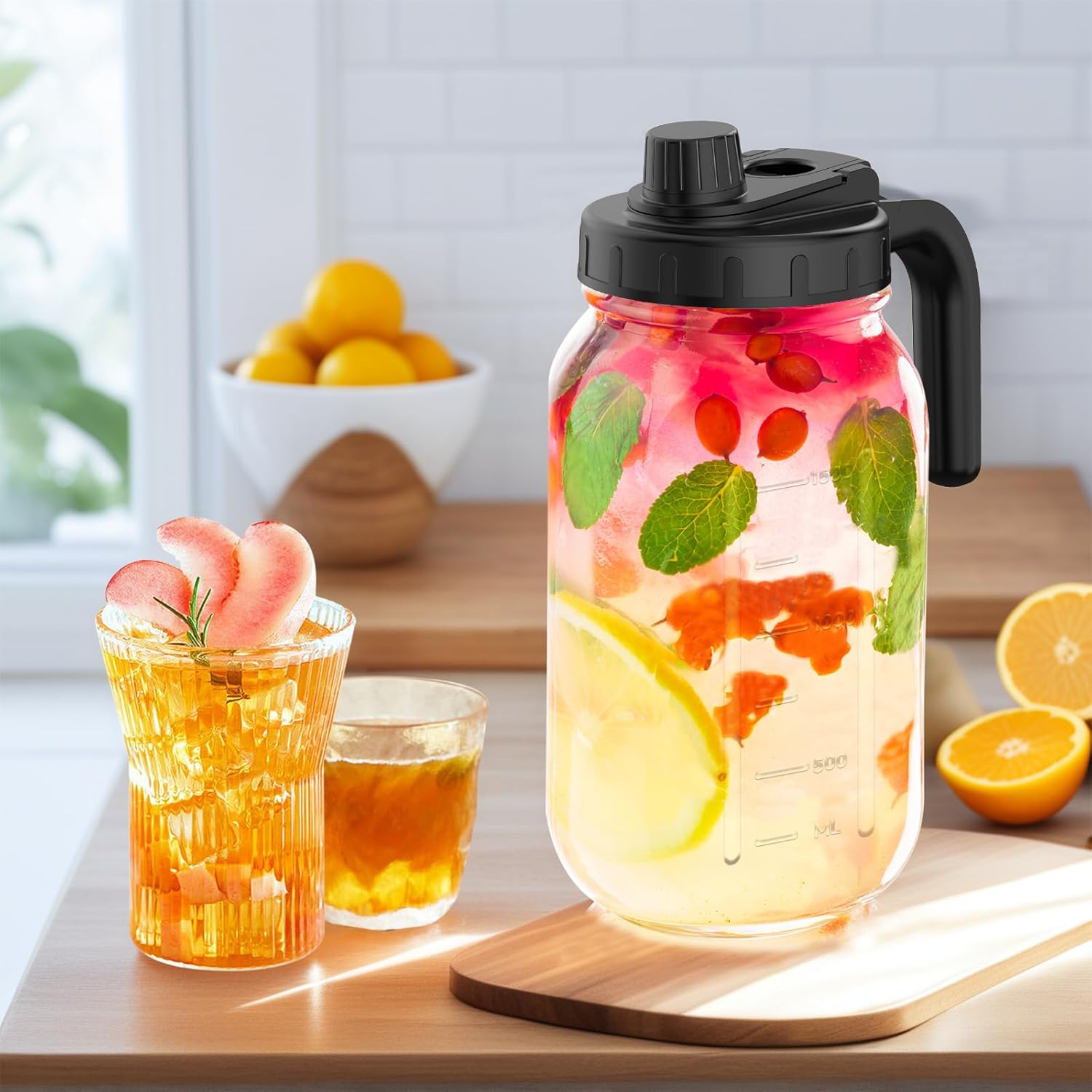 - Durable 64oz Glass Pitcher: Crafted from high-quality, thick glass, these 64oz mason jar pitchers are built to last. Perfect for iced tea, lemonade, cold brew coffee, or water, ensuring long-term use without worrying about cracks or leaks.