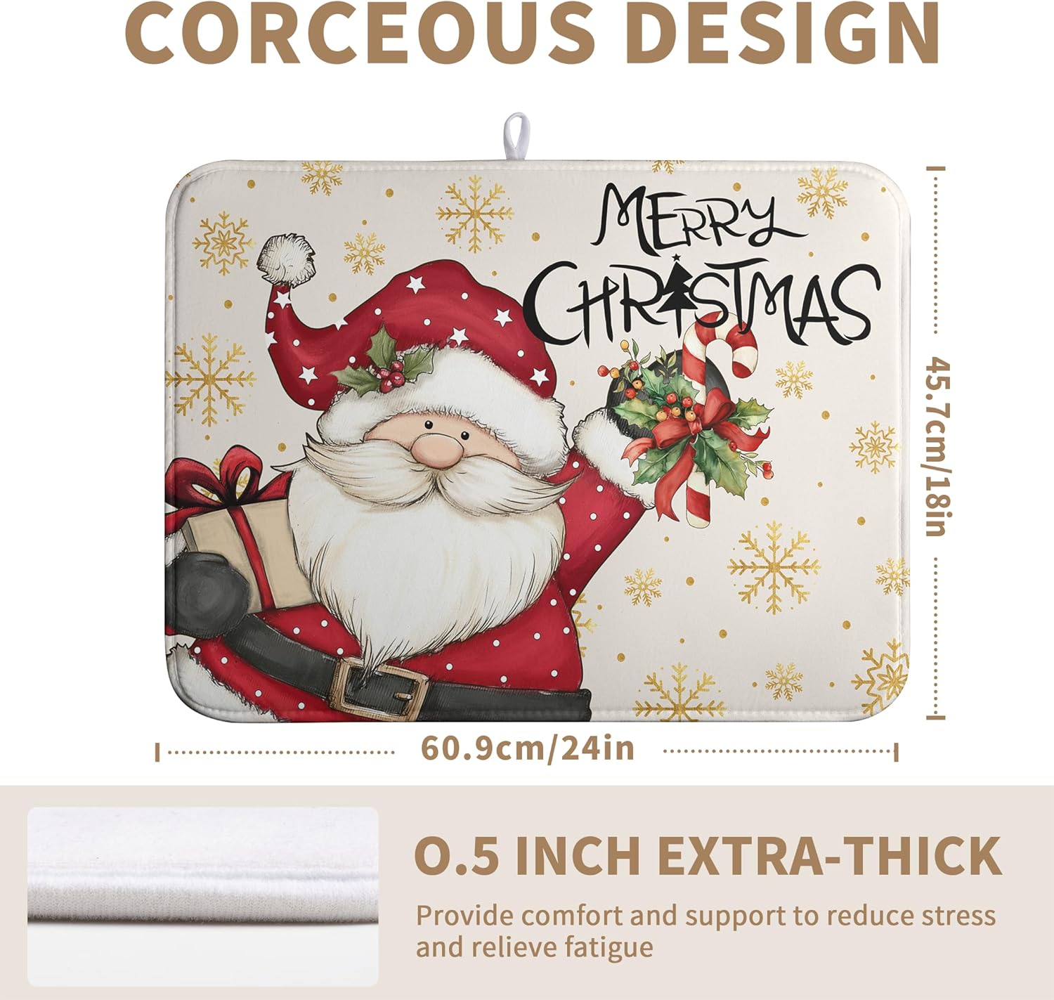 - [Multiple Usage] The size of the santa themed kitchen drying mat is 18x24 inches, which can hold large pots, pans, dish drying racks, and even fit under coffee maker and can also be as a pet food mat. So the winter snow dish mats for drying dishes would be a good Christmas gift.