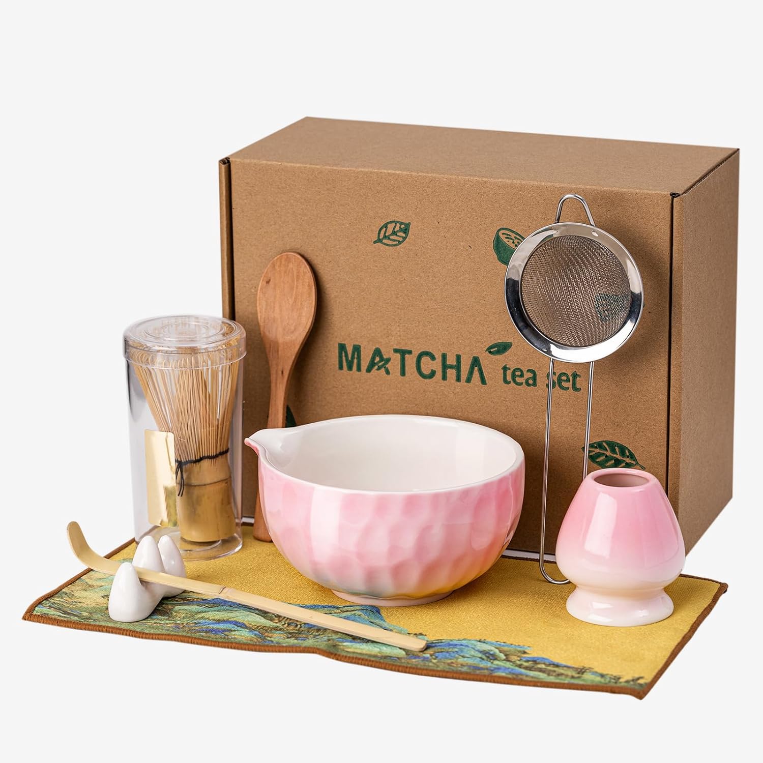 - 【MATCHA WHISK SET】This Japanese matcha kit includes essentials for an authentic matcha experience: 1* bamboo matcha whisk, 2* bamboo scoop, 1* scoop rest, 1* stainless steel sifter, 1* 530 ml/18 oz ceramic matcha bowl with pouring spout (Chawan), 1* whisk holder, 1* tea towel.
