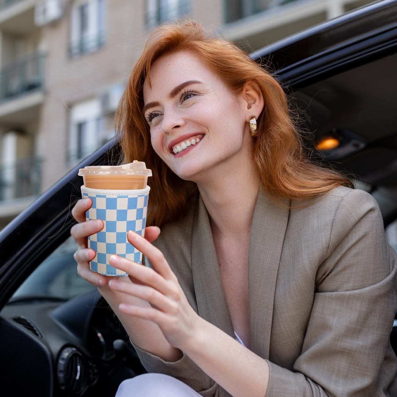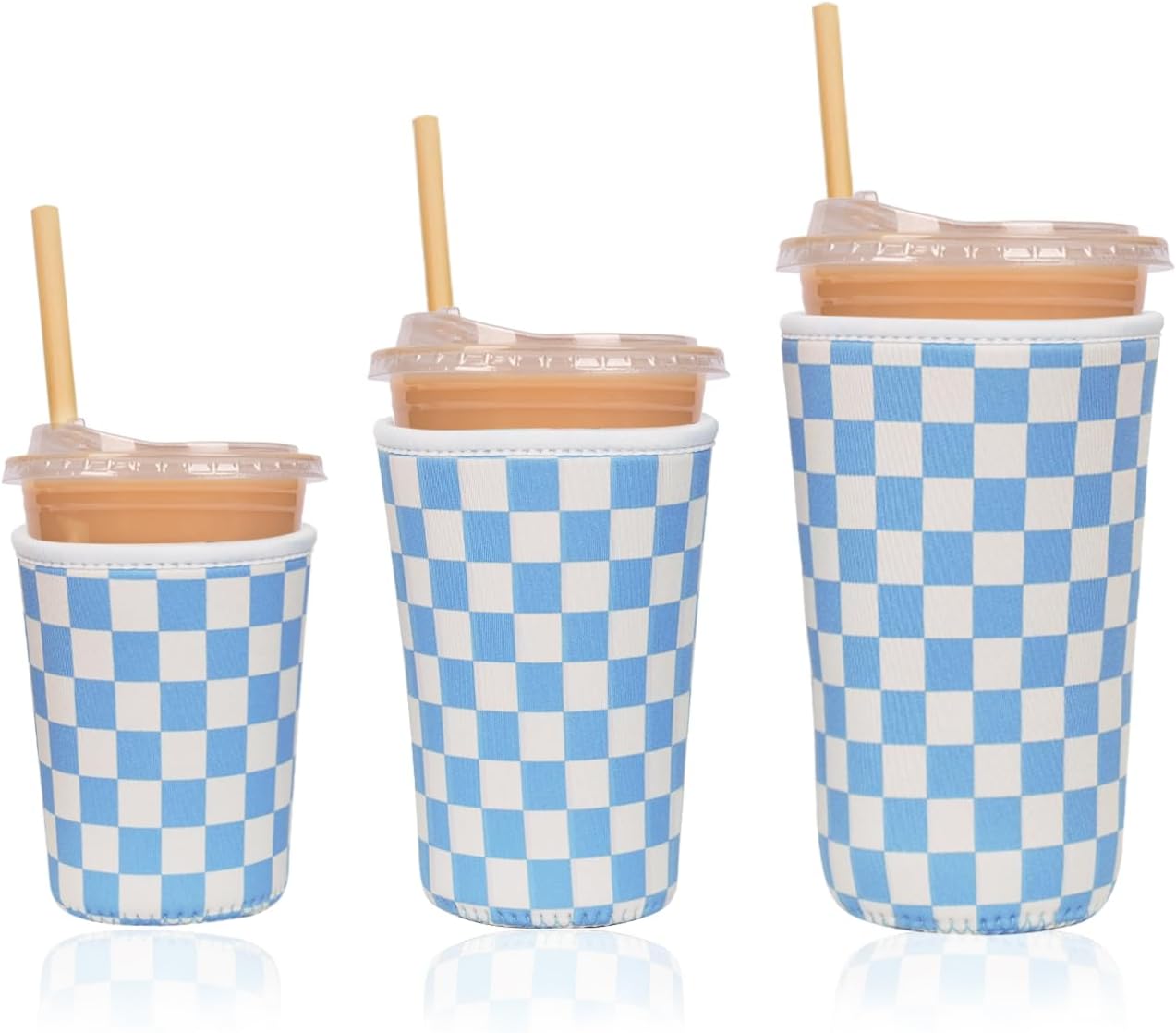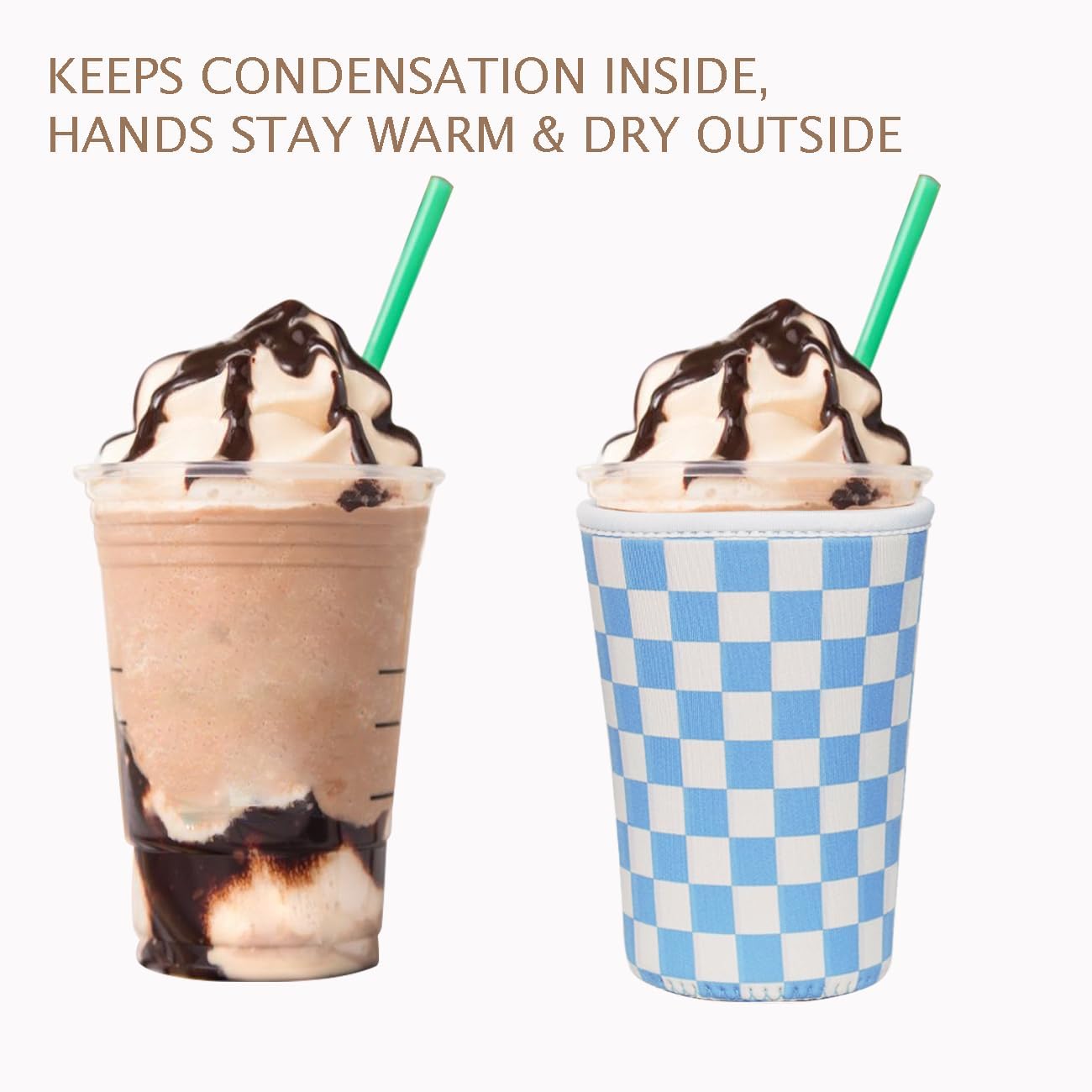 Reusable Insulated Neoprene Iced Coffee Cup Sleeve, Durable Drink Sleeve for Cold Beverages, Beverage Holder for Iced Coffee, Blue Grid