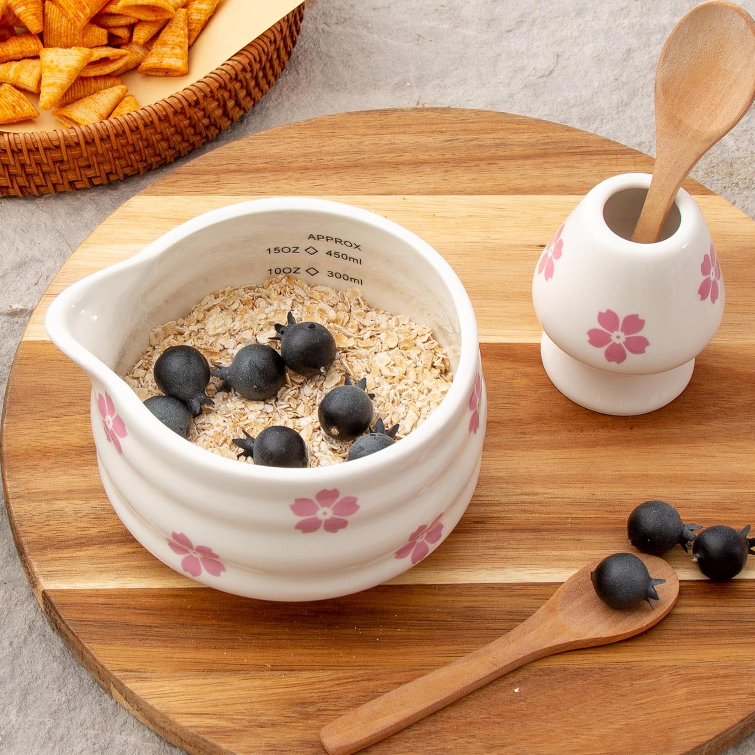 2pcs Matcha Bowl with Whisk Holder, Ceramic Cherry Blossom Matcha Bowl with Spout, 16.5OZ Porcelain Bowl with Measurement Marks,Tea Mixing Bowl with Whisk Stand, Matcha Gift (sakura)