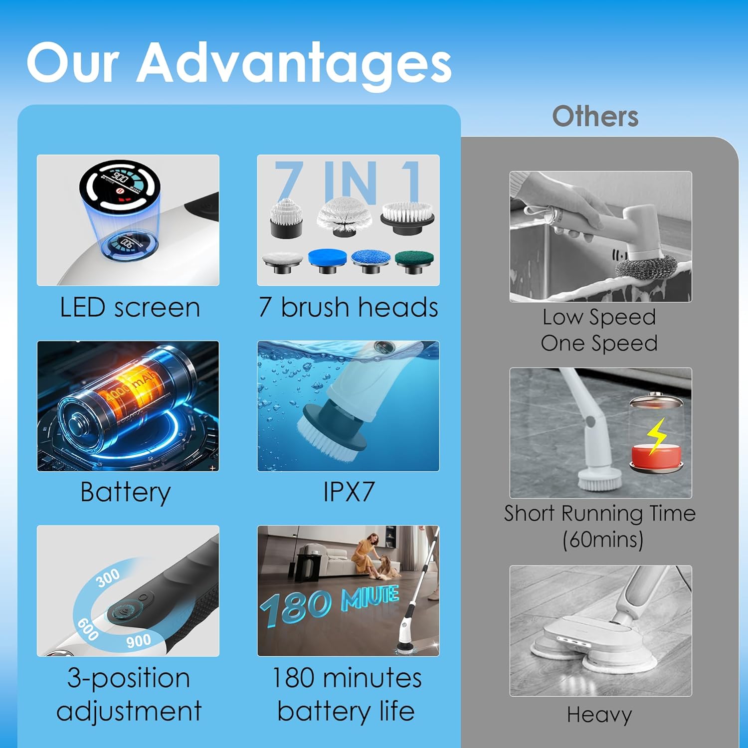- Long Runtime & Quick Recharge – This cordless electric spin scrubber features a 4000mAh battery that charges in just 3.5 hours and runs up to 180 minutes, perfect for whole-home deep cleaning without interruption.