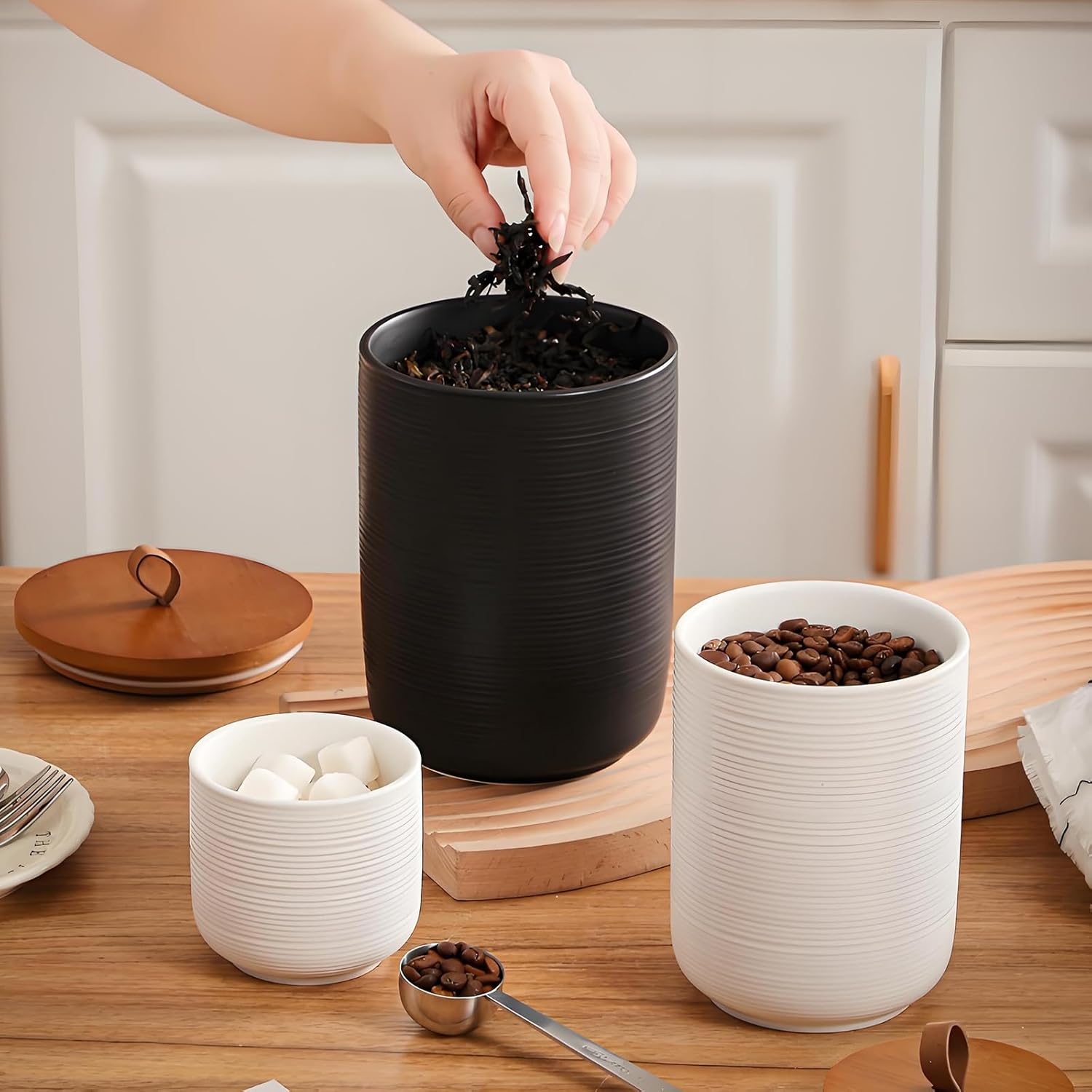 Food Storage Jar Strong Ceramic Storage Canisters with Airtight Wooden Lid,Kitchen Storage Containers for Serving Coffee Beans, Tea, Sugar, Salt, Spices (Black three-piece set)