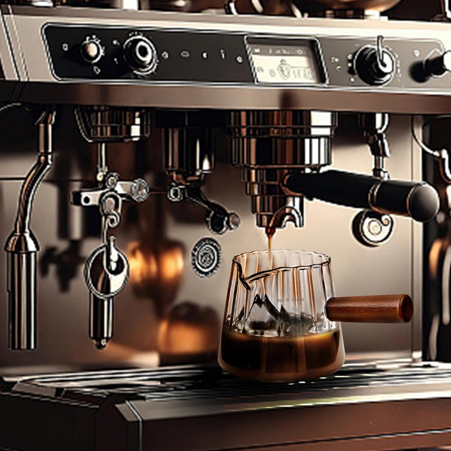 - 4. Ergonomic Wooden Handle:The natural wood handle of this espresso glass is not only aesthetically pleasing, but also practical—The espresso measuring cup stays cool to the touch even when the glass is hot. Ergonomically shaped for a secure grip, it adds both functionality and a premium, modern look to your kitchen, coffee bar and espresso accessories.
