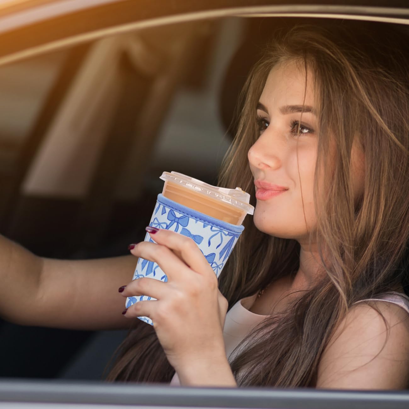 Reusable Insulated Neoprene Iced Coffee Cup Sleeve, Durable Drink Sleeve for Cold Beverages, Beverage Holder for Iced Coffee, Blue Bows