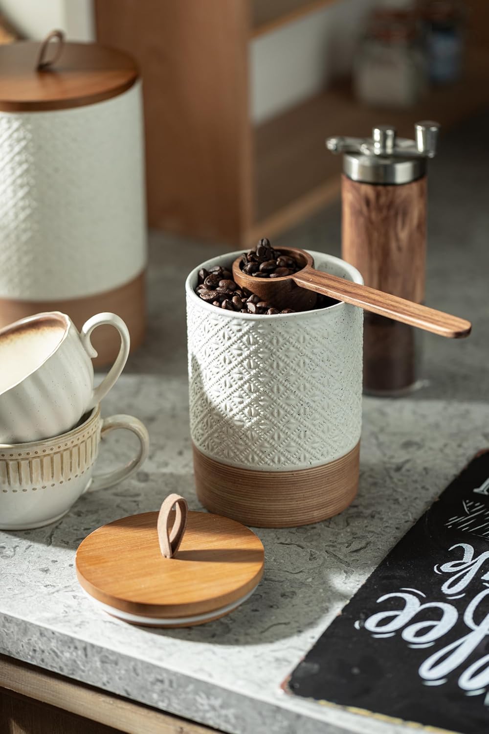 - Ultra-Tight Wooden Lid: The wooden lid with a strong rubber gasket creates an unbeatable airtight seal, keeping air, moisture, and odors far away from your coffee beans and ground coffee, locking in freshness for longer
