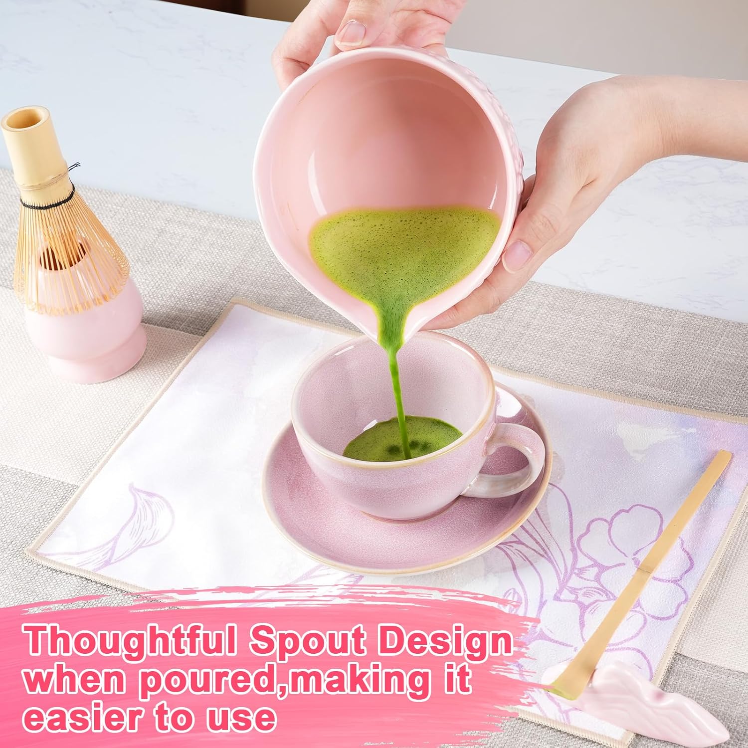 Matcha Whisk Set, Matcha Set 7 Pieces - Ceramic Matcha Bowl with Spout, Bamboo Chasen Whisk & Holder, Scoop, Sifter, Tea Towel - Complete Kit for Matcha Tea Ceremony, Latte, Ideal Gift(Pink)