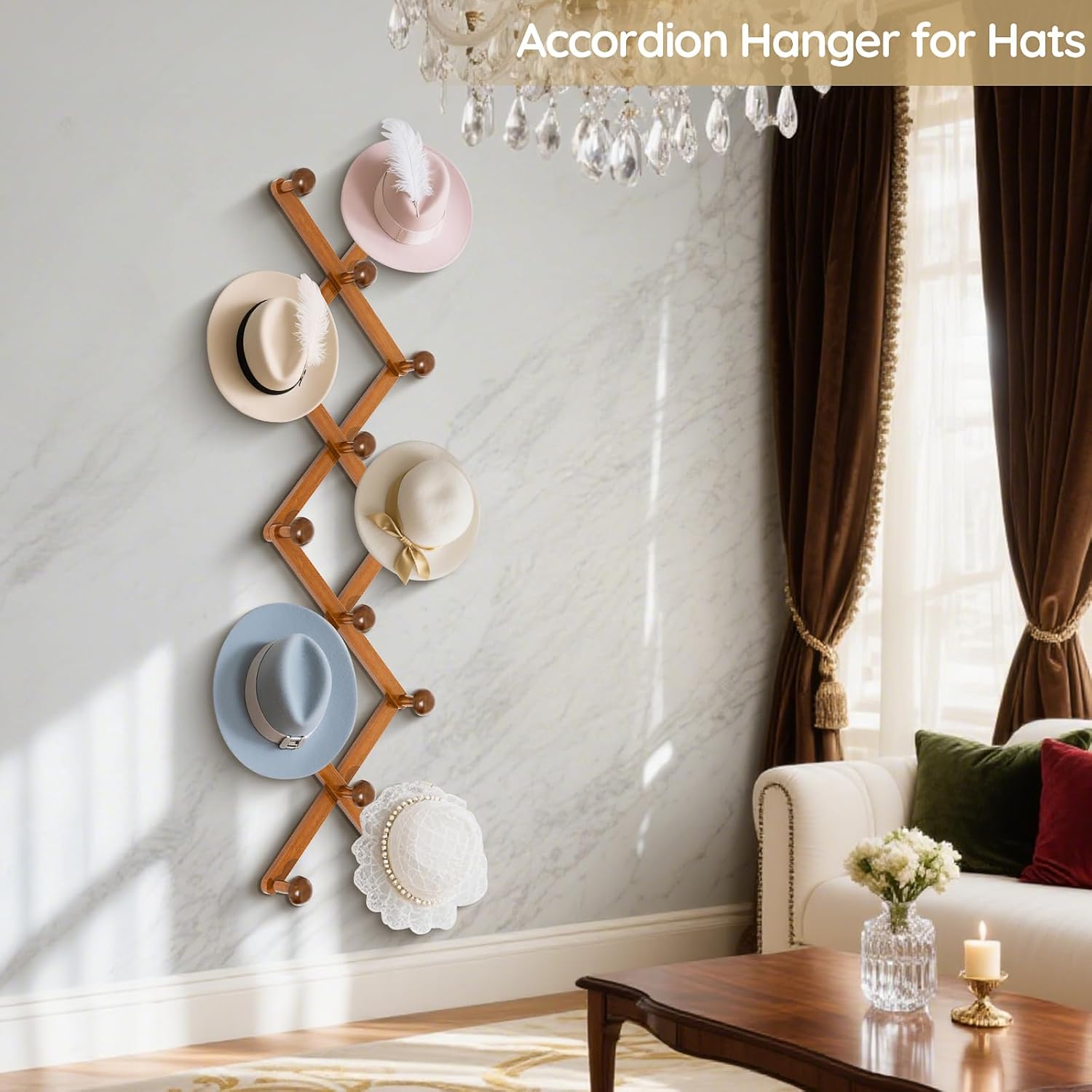 - 【14 Pegs】Solid accordion hat rack with 14 peg hooks. Perfect for hats, scarves, keys, dog leashes, towels, cooking utensils, and everything in between.