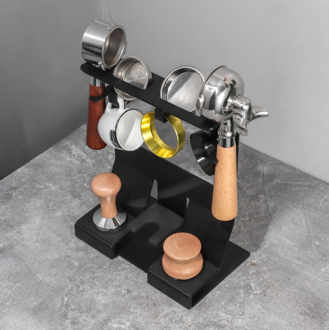 - 【Space-Saving & Dual Function】The compact vertical design maximizes countertop space while displaying your coffee gear in style. Not just for storage — the sturdy base also supports direct tamping for improved workflow. The stable structure and dedicated tamping area allow for quick and efficient workflow, all in one place.