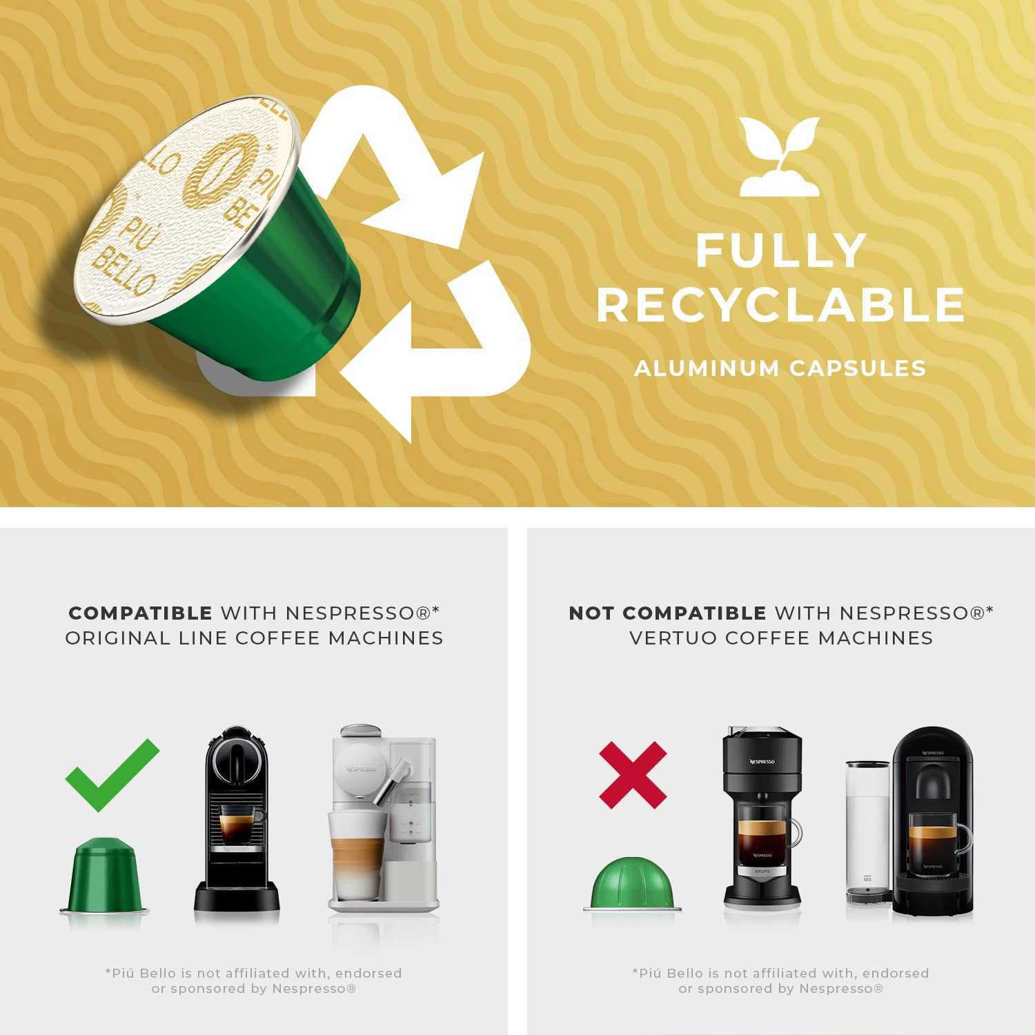 - NESPRESSO COMPATIBLE PODS - Enjoy delicious cafe quality roasted coffee, brewed fast and poured steaming hot & fresh directly into your awaiting cup. Piu Bello Nespresso capsules are compatible with Nespresso Original line espresso machine.