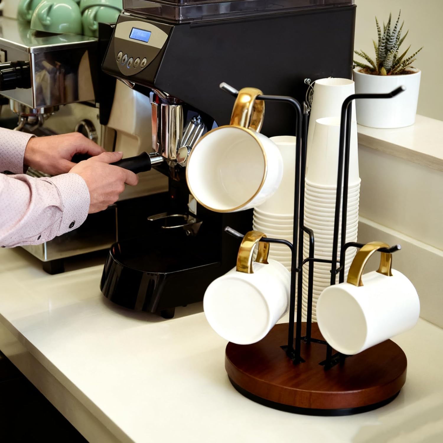 - High Quality Material: Metal Coffee Cup Rack Stand special plating materials are used to prevent rust,Stable Wooden Base.easy to clean, just wipe down with a damp cloth and towel dry to clean