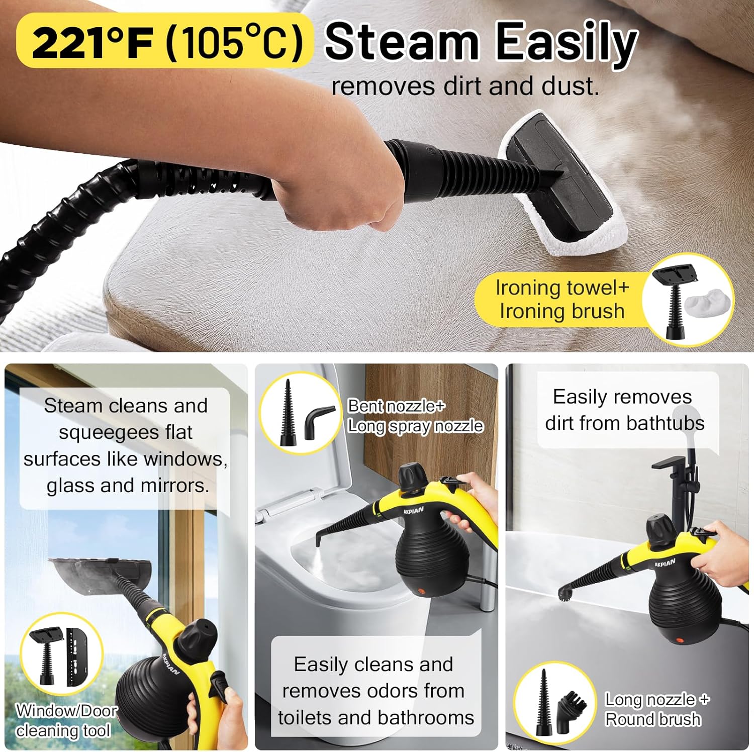 - 【Powerful Hot Steam】: AKPIAN Steam Cleaner heats to produce 221°F (105°C) high temperature steam to clean grime, dust, grease, and more. Make your home as good as new.