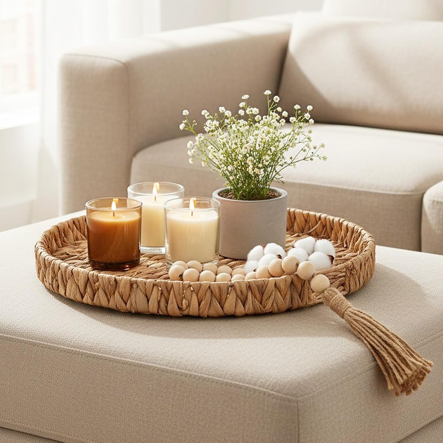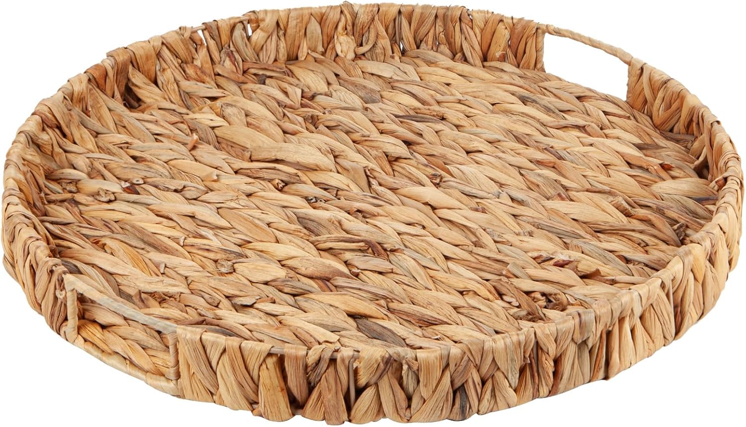 Round Ottoman Tray Large Wicker Serving Tray with Handles for Coffee Table, 18 Inch Handwoven Natural Water Hyacinth Tray