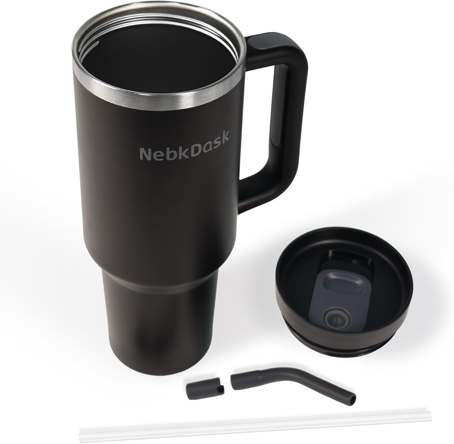 40 oz Water Bottle with Handle & Straw – Insulated Stainless Steel Bottle, Leakproof, Fits in Cup Holder – Reusable Cold Drink Thermos for Women & Men (Black)