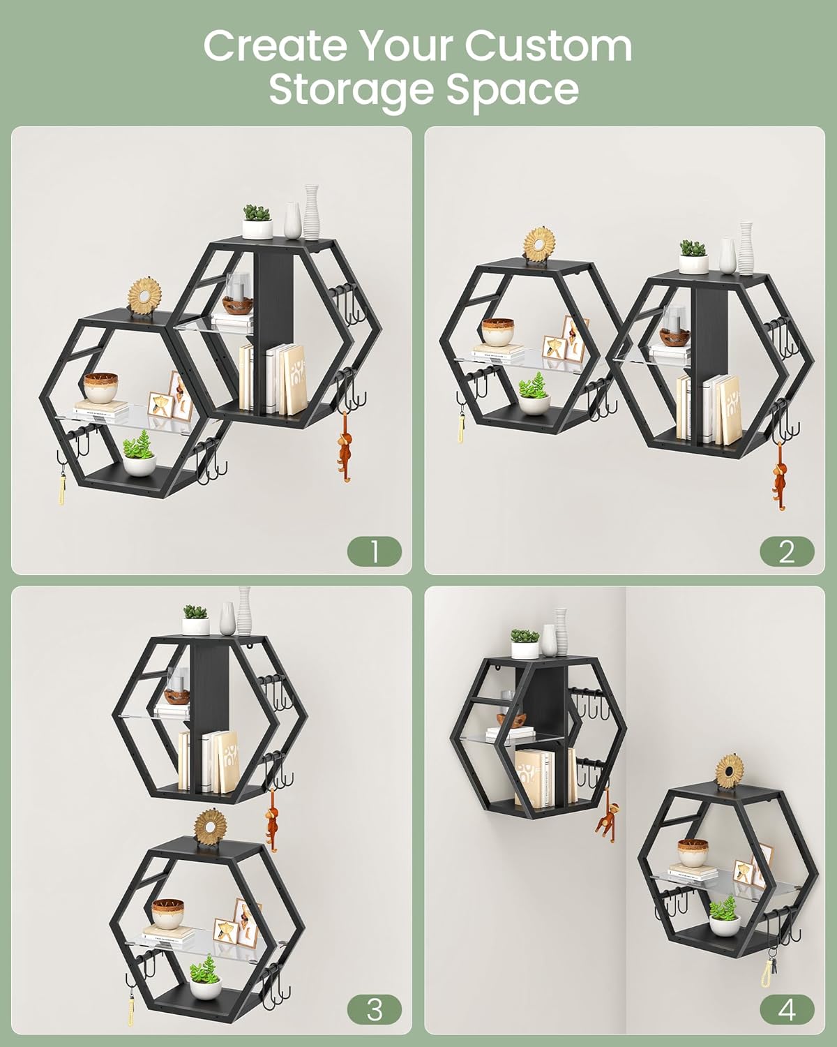 Hexagon Floating Shelves Set of 2, Glass Hanging Shelves for Wall Decor, Industrial Style Wall Storage Rack and 12 S-Hooks, for Living Room, Bedroom, Office, Game Center, Black TBJ08BB