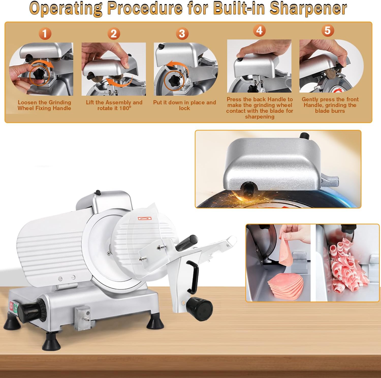 - 250W High-Efficiency Motor: This meat slicer is equipped with a 250W motor, delivering powerful performance with a speed range of 350-400 RPM. Paired with its sharp blade, it can efficiently slice 40-60 pieces per minute. It also features a built-in dual-stone sharpener for easy blade maintenance—keeping the blade sharp, preserving cutting efficiency, and enabling quick slicing through various ingredients to significantly boost your workflow.