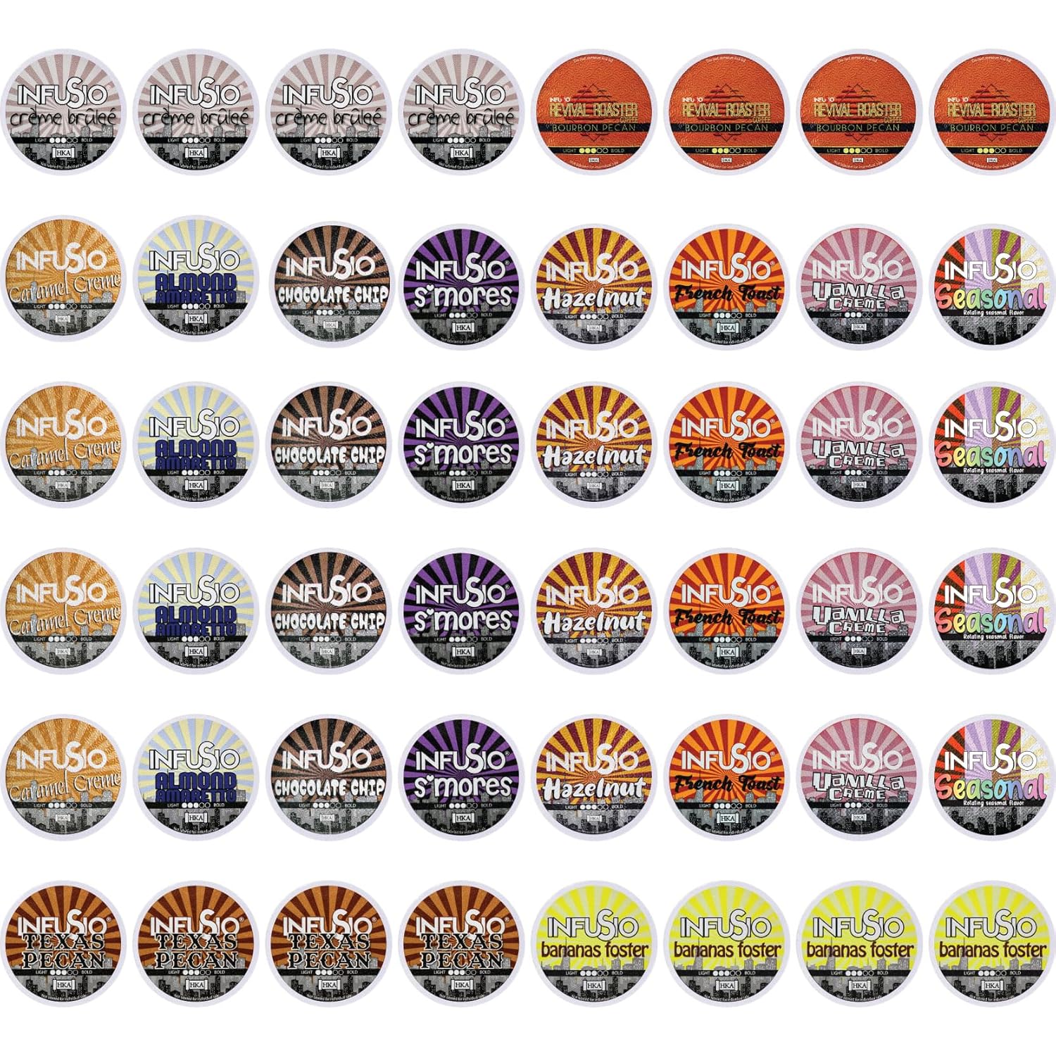 InfuSio Flavored Coffee Pods Variety Pack โ 48 Count, 12 Gourmet Medium Roast Dessert-Inspired Blends like Bananas Foster & Crรจme Brรปlรฉe, Compatible with Keurig K-Cup 2.0 Brewers