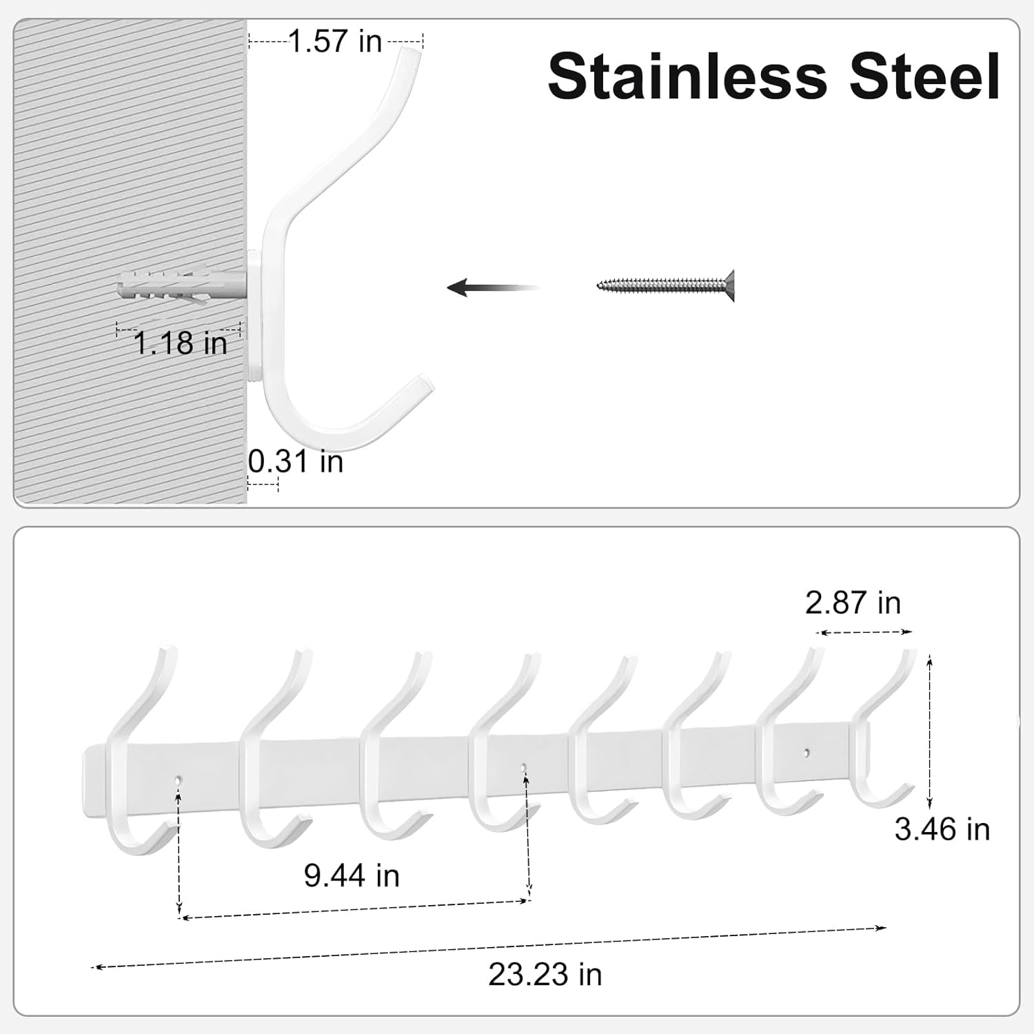 White Wall Hooks Heavy Duty, 23 Inch Coat Hooks Wall Mount with 8 Hooks, Wall Hooks Hangers for Entryway, Bathroom - for Hanging Backpack, Bag, Coat, Purse, Hat, Towel, Clothes