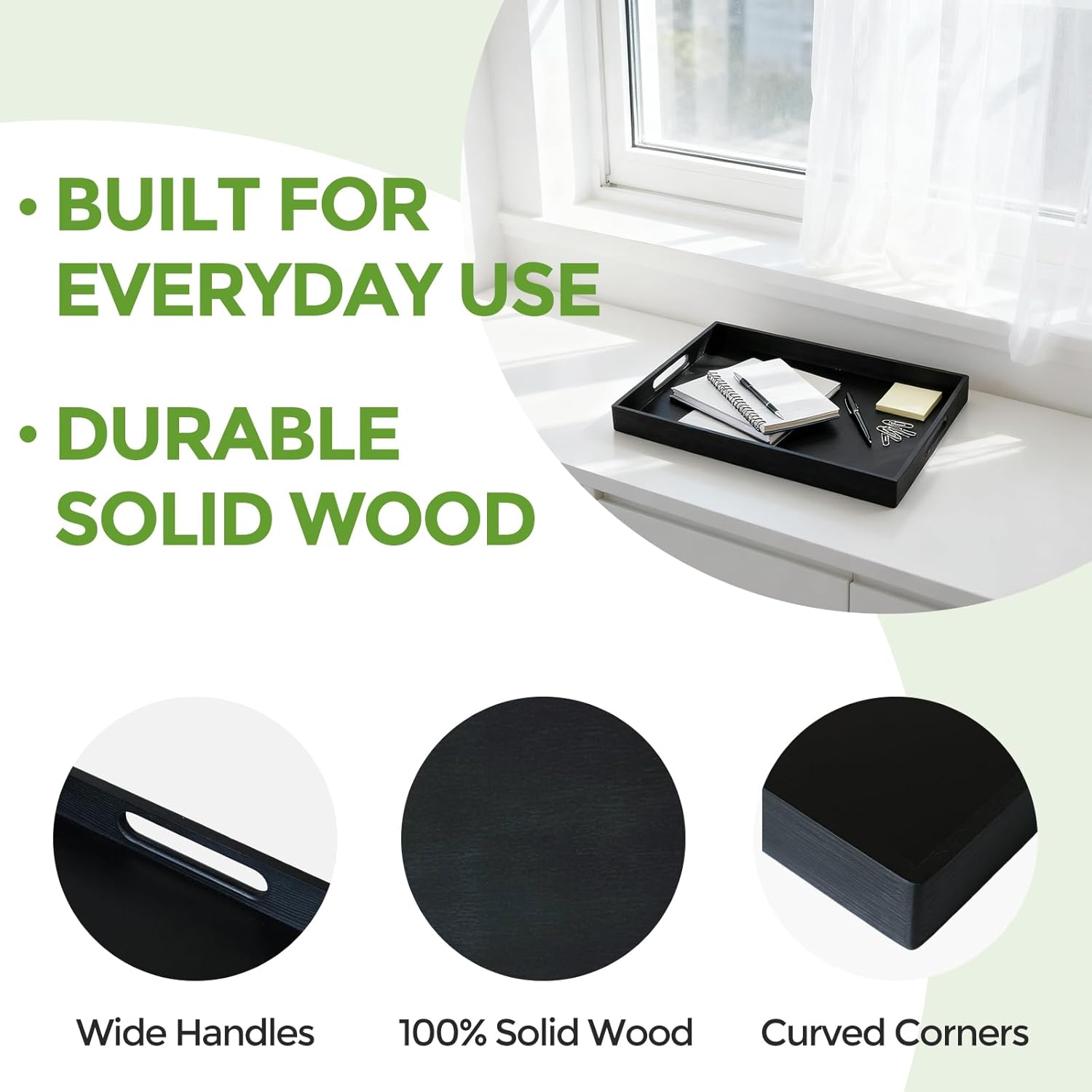 S310 Black Wood Serving Tray with Handles, 17 Inch Wooden Tray for Ottoman, Breakfast, Lunch, Dinner, Decorative Rectangular Tray for Living Room, Kitchen Counter, Outdoor