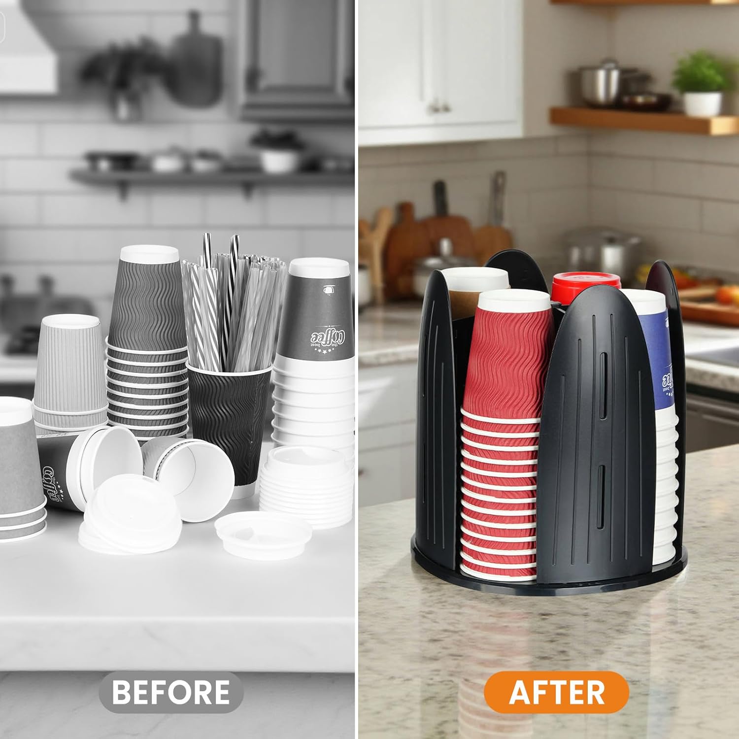 - STYLISH AND DURABLE: Coffee cup & lid storage carousel is constructed from sturdy, damage-resistant ABS plastic, the hollow structure promotes ventilation to keep paper cups fresh and dry.