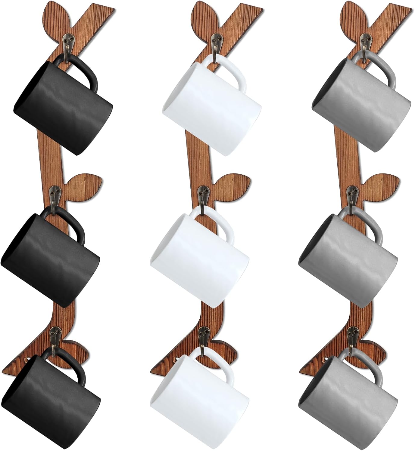 3 Pack Wood Coffee Mug Wall Rack with 9 Hooks Wall Mount Coffee Cup Holder Wooden Espresso Cup Holder Tree Brown Mug Stand Display Wall Mounted Cup Drying Rack for Kitchen Cafe