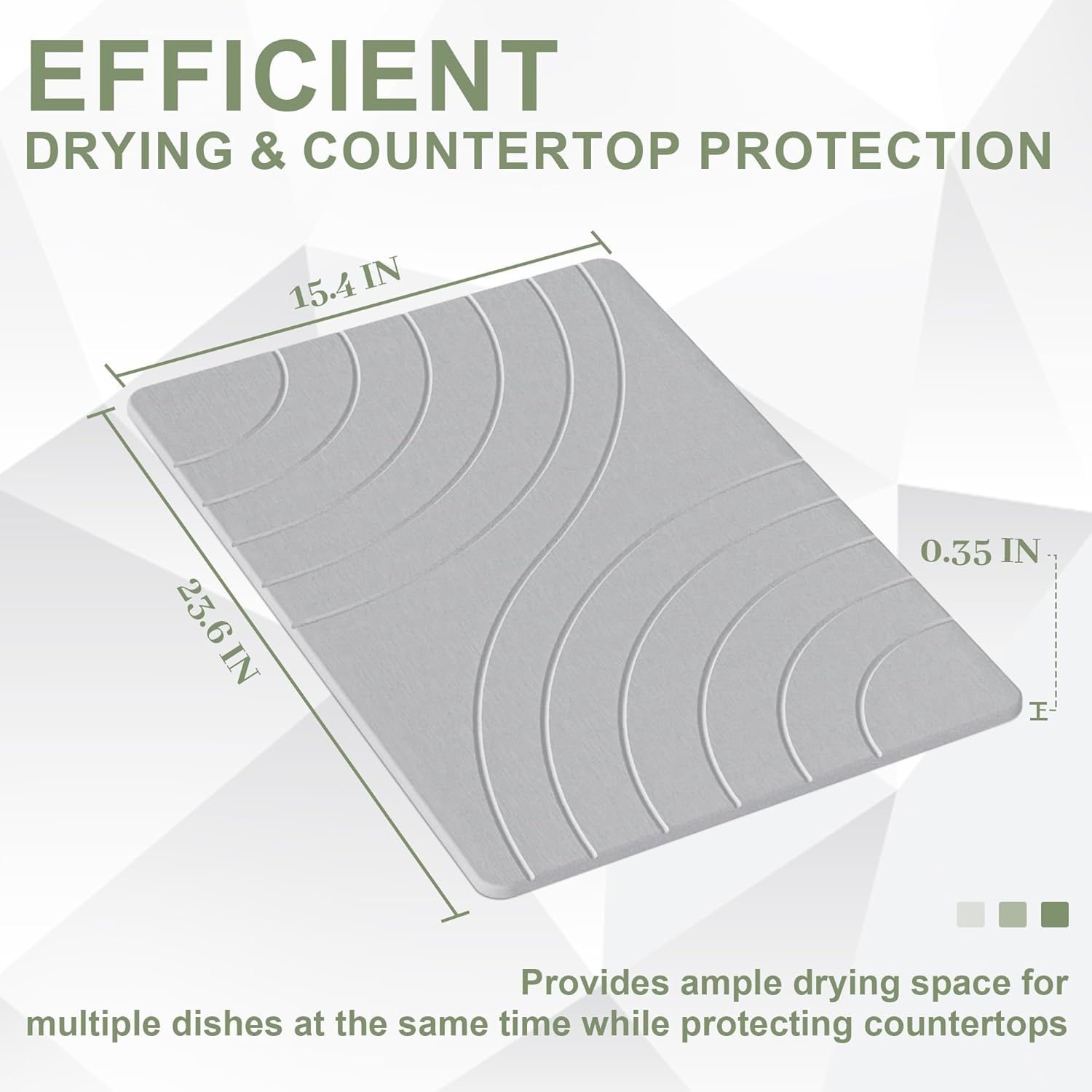 - [SPACIOUS DRYING PLATFORM]:This stone drying mats measures 23.62 inches long and 15.35 inches wide, providing a spacious drying space for multiple dishes at the same time. The package contains 1 kitchen drying mat, 1 anti-slip net, 1 piece of sandpaper and instruction manual. Its included non-slip net can fix the drying mat on the kitchen countertop, increase the friction to avoid the drying mat and pots and pans from slipping.