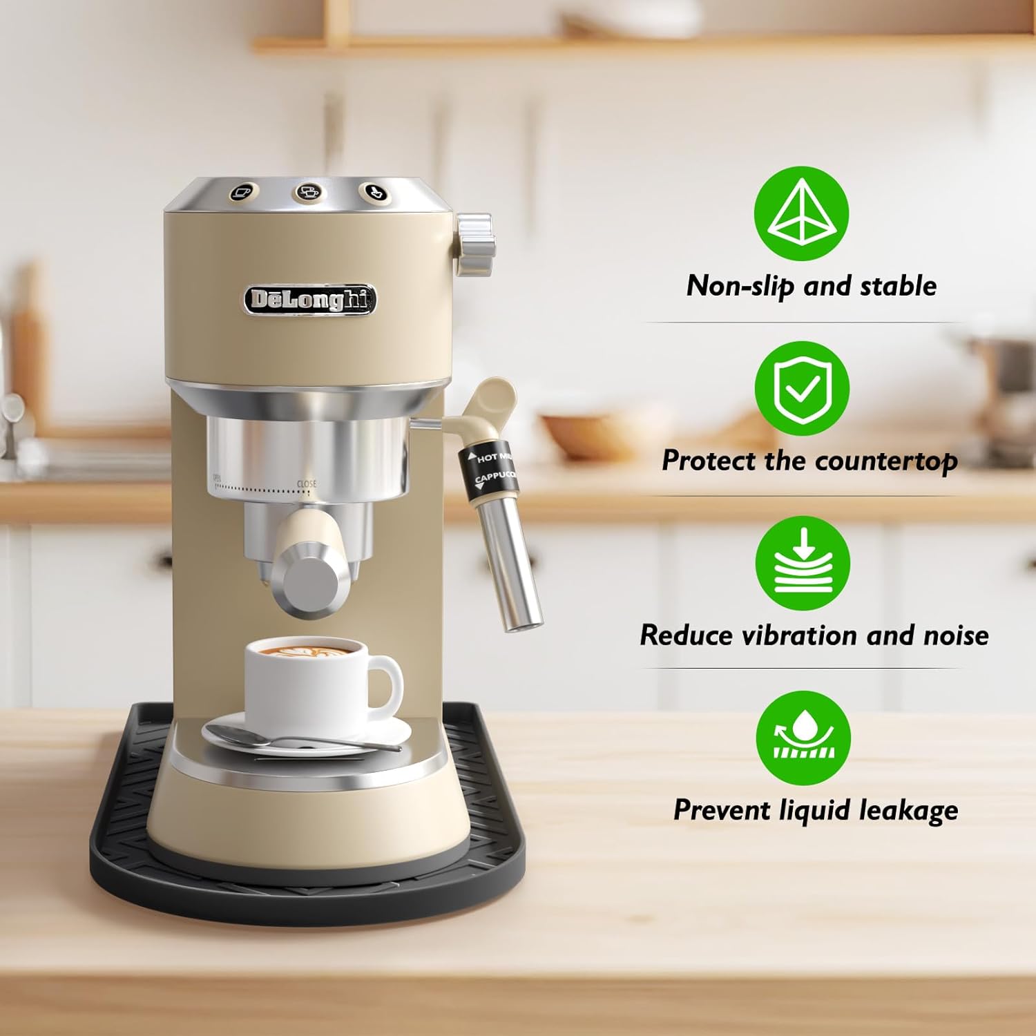 - Protect Counters & Appliances:Our coffee bar mat made of high-temperature resistant silicone (up to 446°F/230°C), it effectively absorbs heat from the coffee machine, avoiding thermal damage to wooden, marble, or quartz countertops. It also acts as a buffer against accidental spills, keeping both the counter and machine clean