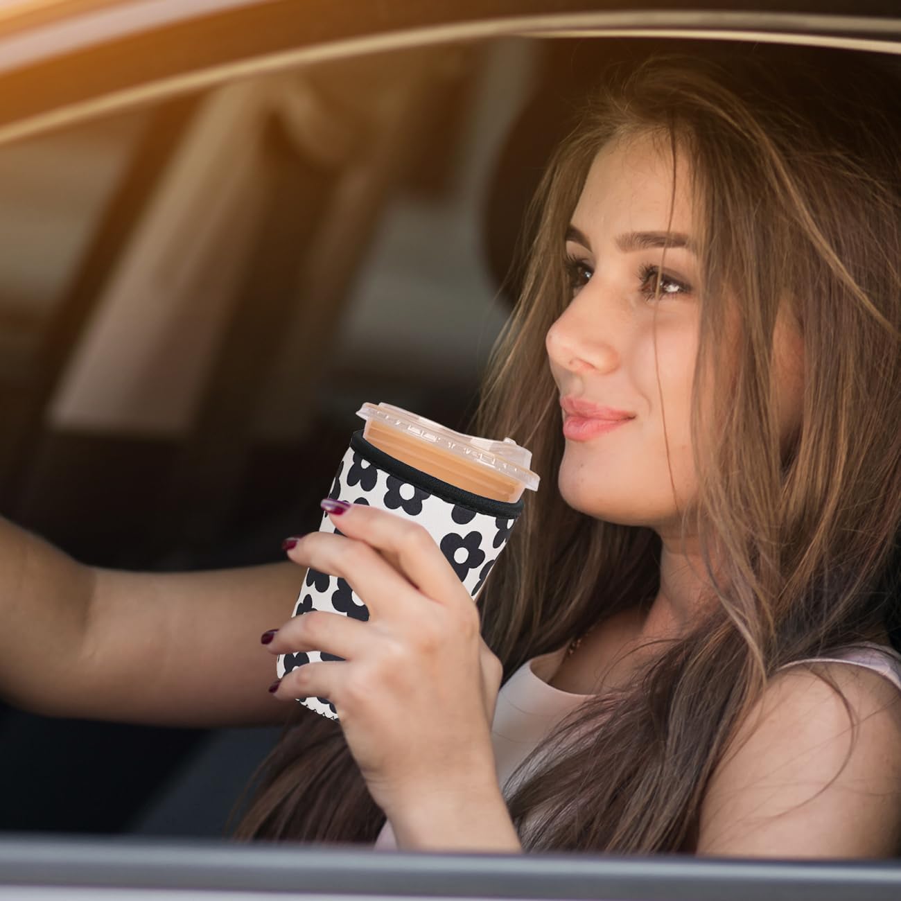 Reusable Insulated Neoprene Iced Coffee Cup Sleeve, Durable Drink Sleeve for Cold Beverages, Beverage Holder for Iced Coffee, Black Flowers