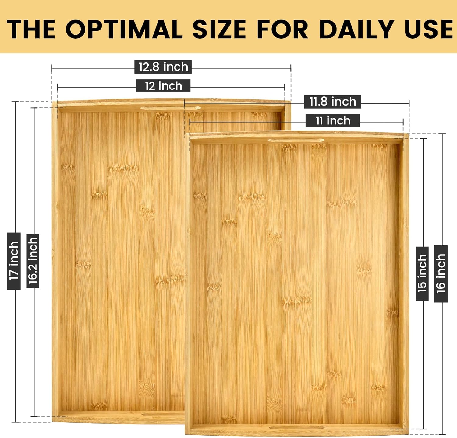 - TWO SIZES, 2 SETS EACH: Each size of this bamboo serving tray includes 2 sets. The large (17" x 13" x 1.5") is great for displays or appetizers. The small (16" x 12" x 1.5") fits small spaces/coffee tables and stacks to save storage