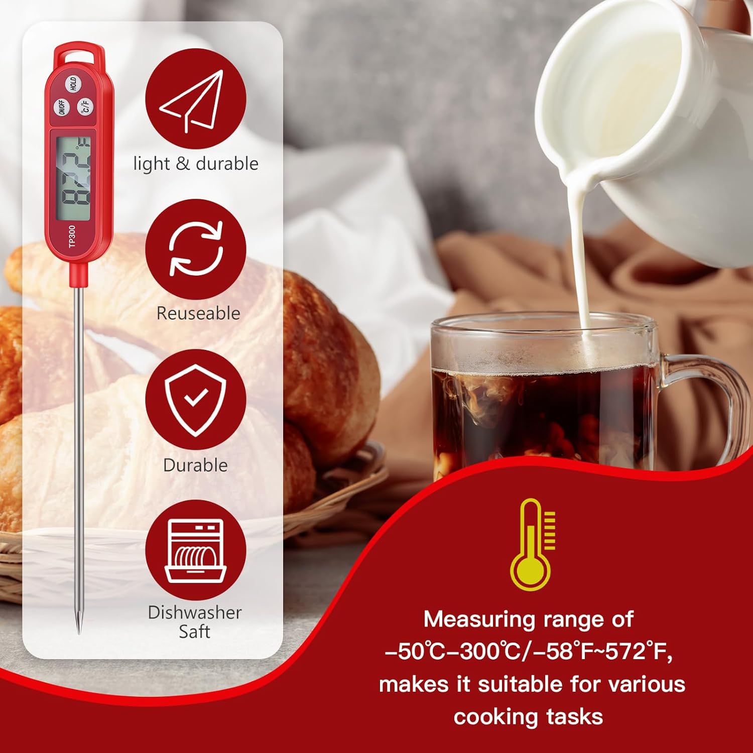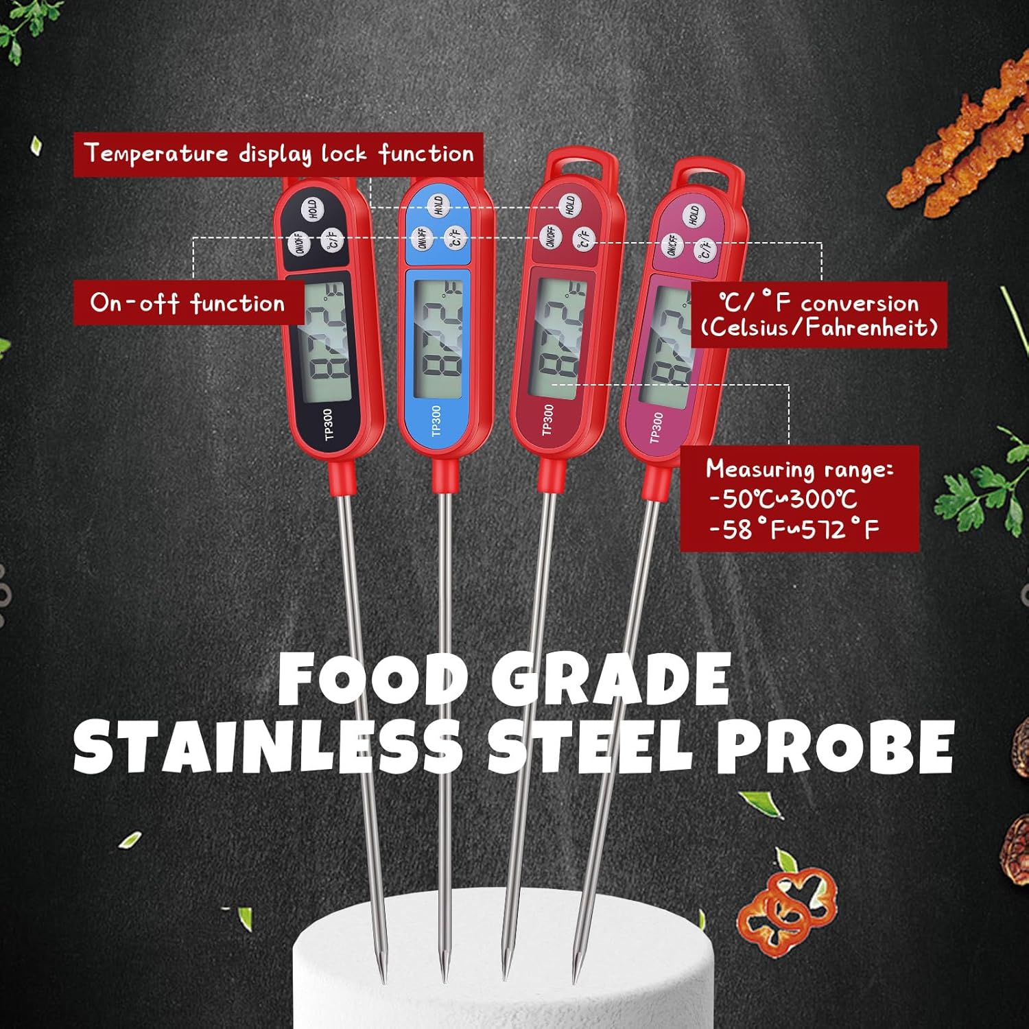 - Widely Usages: the digital thermometer for food can be applied to different occasions, suitable for barbecuing, frying pans, meat preparation, soup making, frying, candy making, icing, milk heating, and more, which can help you control the temperature precisely